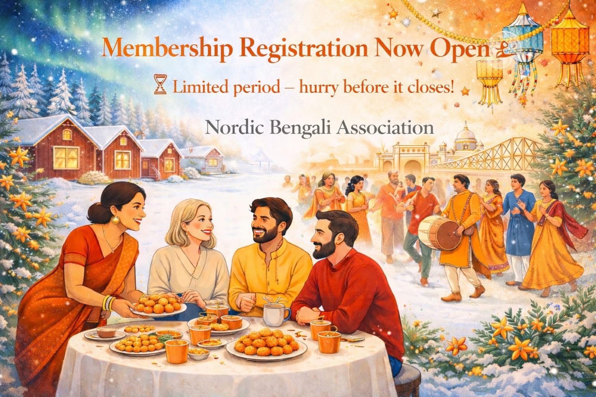 Our vision is to create a space where Bengalis and friends of Bengal, from all backgrounds and generations, can come together, connect, and keep our rich heritage alive while embracing the beautiful diversity of the Nordic region. We invite you to be part of this journey: to celebrate, volunteer, share a meal, sing along, and make memories. This is just the beginning, and with every smile, every drumbeat, and every prayer, we'll build a tradition that will grow stronger year after year.